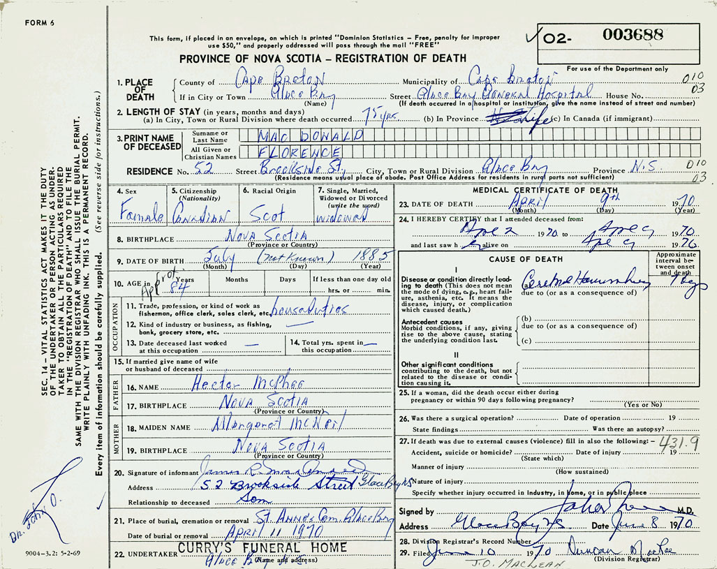 1. PLACE OF DEATH County of Cape Breton If in City or Town Glace Bay