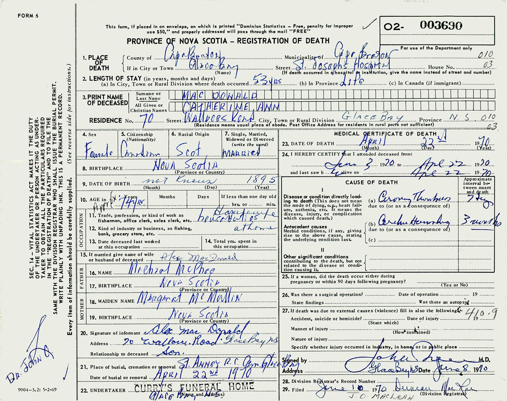 1. PLACE OF DEATH County of Cape Breton If in City or Town Glace Bay