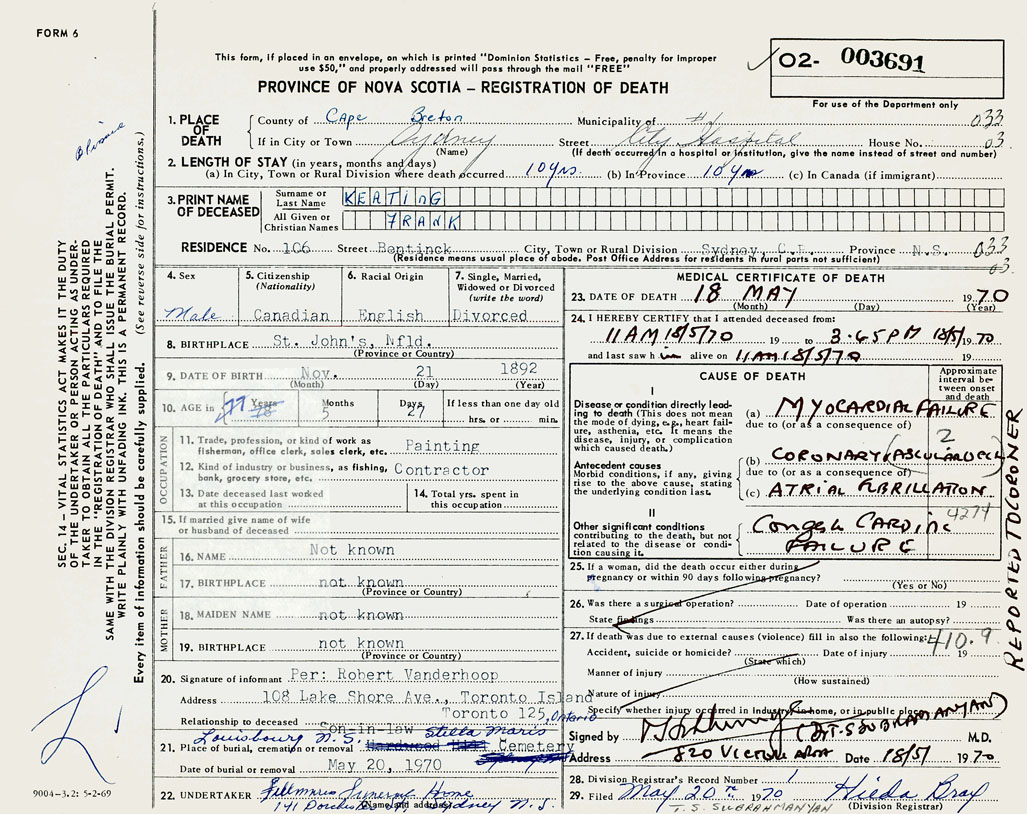 PROVINCE OF NOVA SCOTIA — REGISTRATION OF DEATH