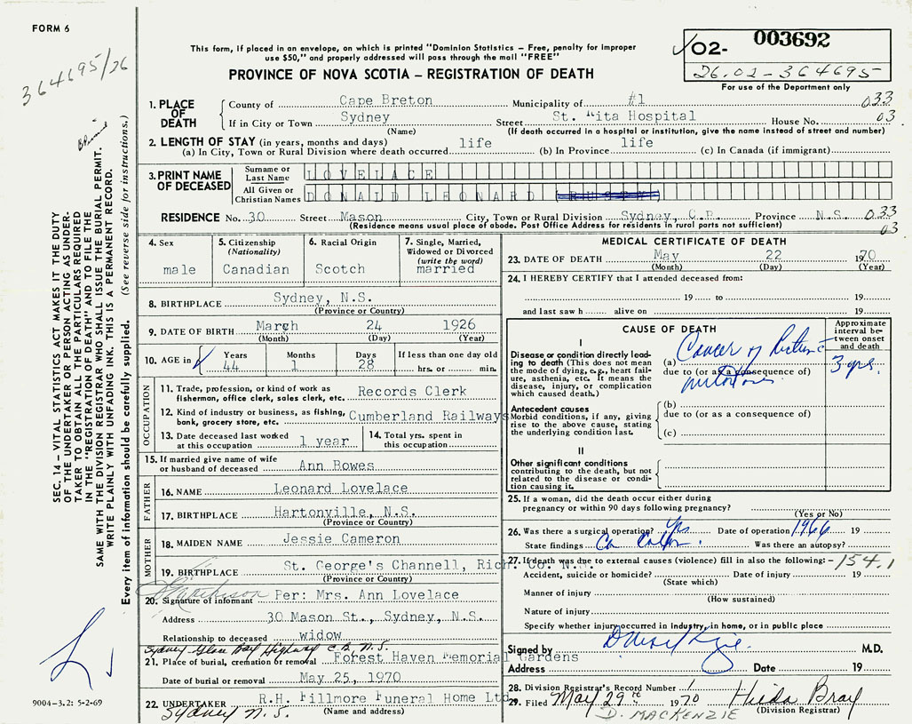 PROVINCE OF NOVA SCOTIA — REGISTRATION OF DEATH