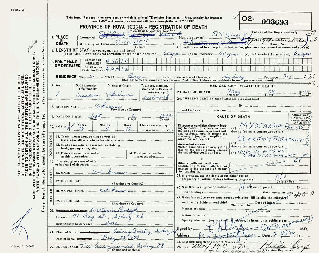 PROVINCE OF NOVA SCOTIA — REGISTRATION OF DEATH
