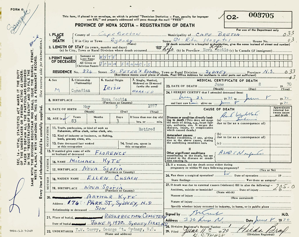 1. PLACE OF DEATH County of Cape Breton If in City or Town Sydney