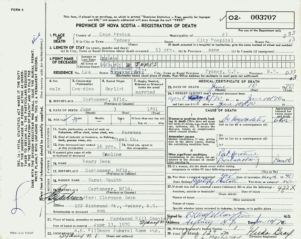 1. PLACE OF DEATH County of Cape Breton If in City or Town Sydney