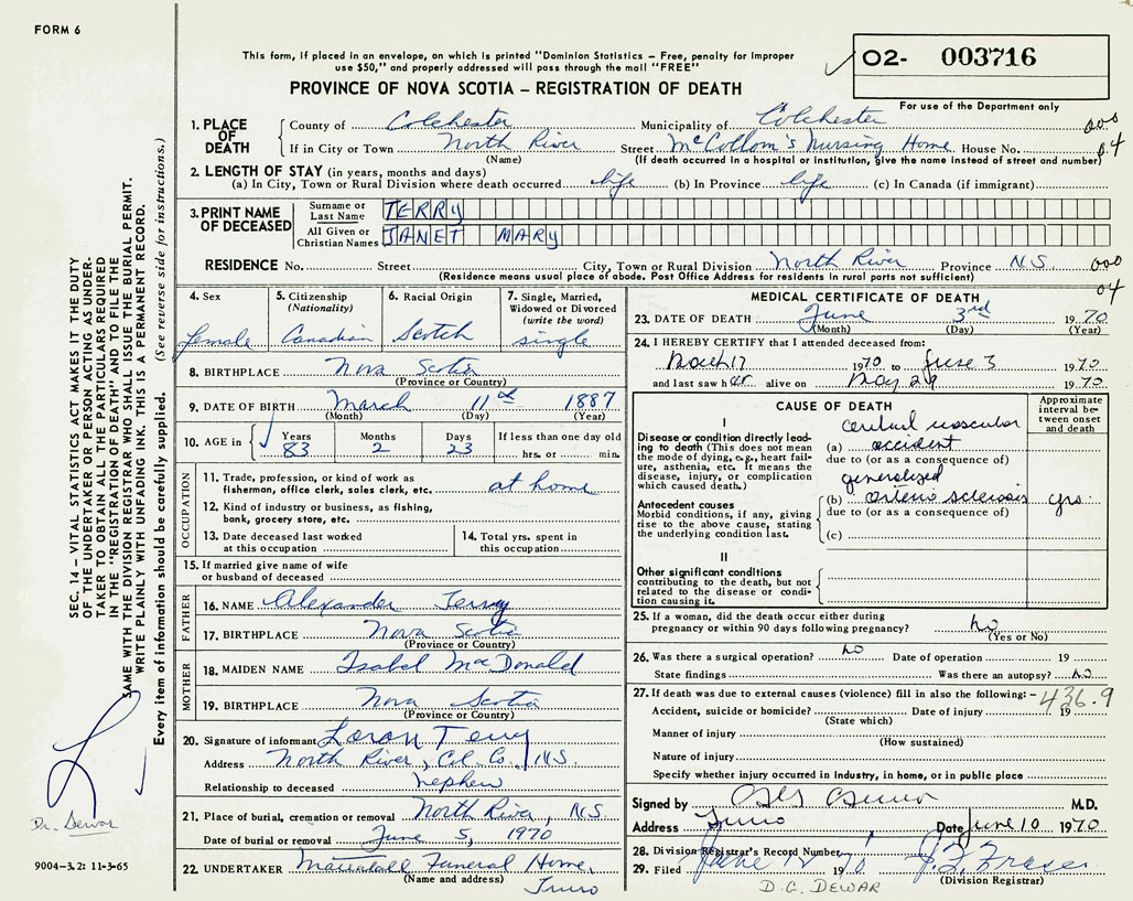 PROVINCE OF NOVA SCOTIA — REGISTRATION OF DEATH