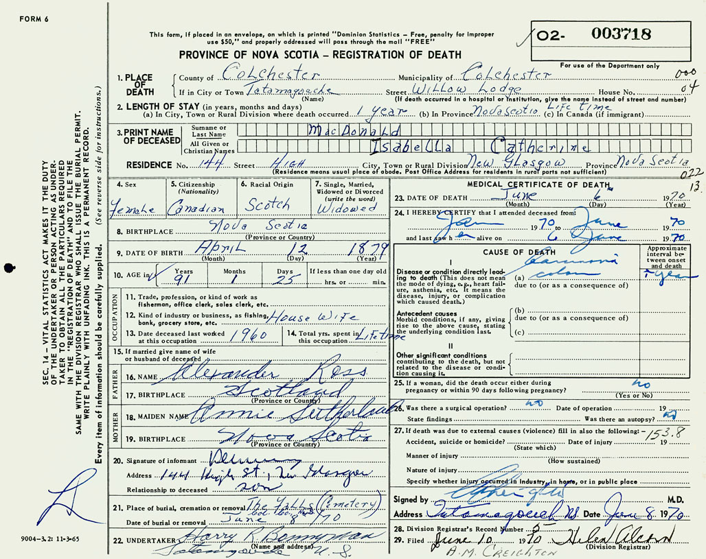 PROVINCE OF NOVA SCOTIA — REGISTRATION OF DEATH