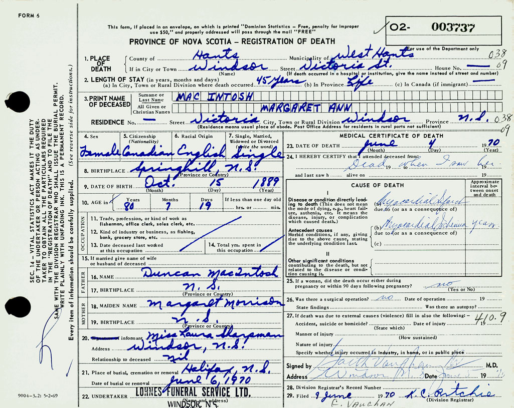 PROVINCE OF NOVA SCOTIA — REGISTRATION OF DEATH