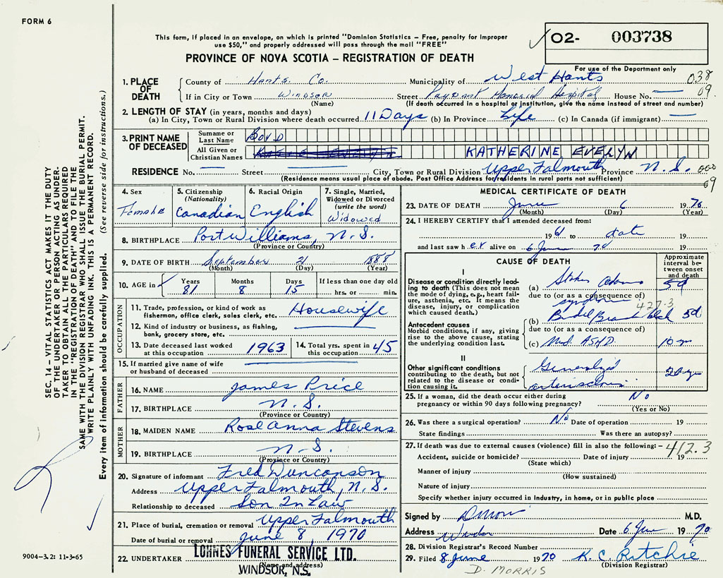 PROVINCE OF NOVA SCOTIA — REGISTRATION OF DEATH