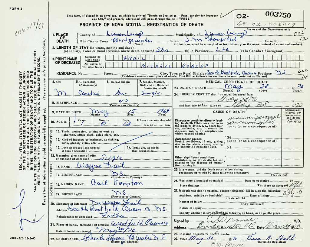 PROVINCE OF NOVA SCOTIA — REGISTRATION OF DEATH