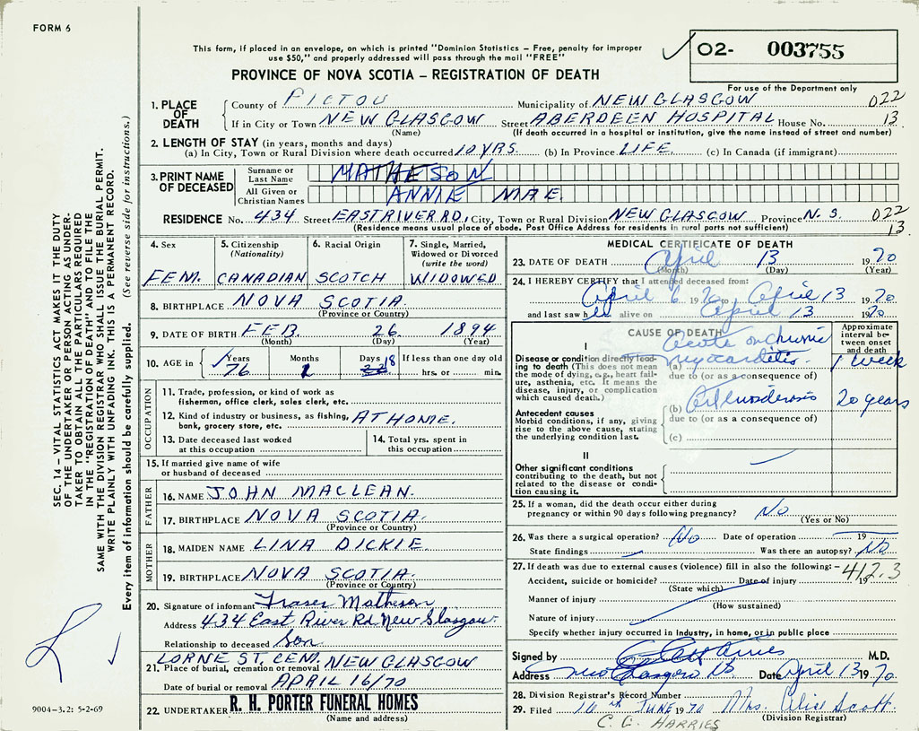 1. PLACE OF DEATH County of Pictou If in City or Town New Glasgow