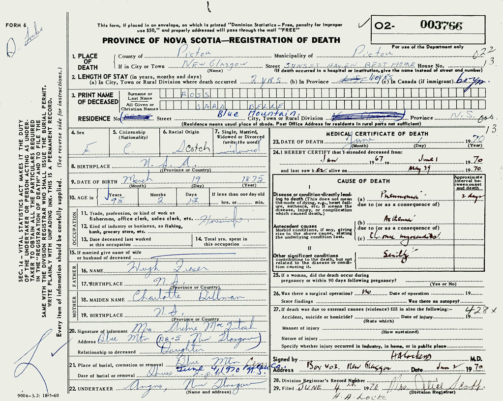 21. Place of burial Blue Mountain Cemetery, Pictou Co