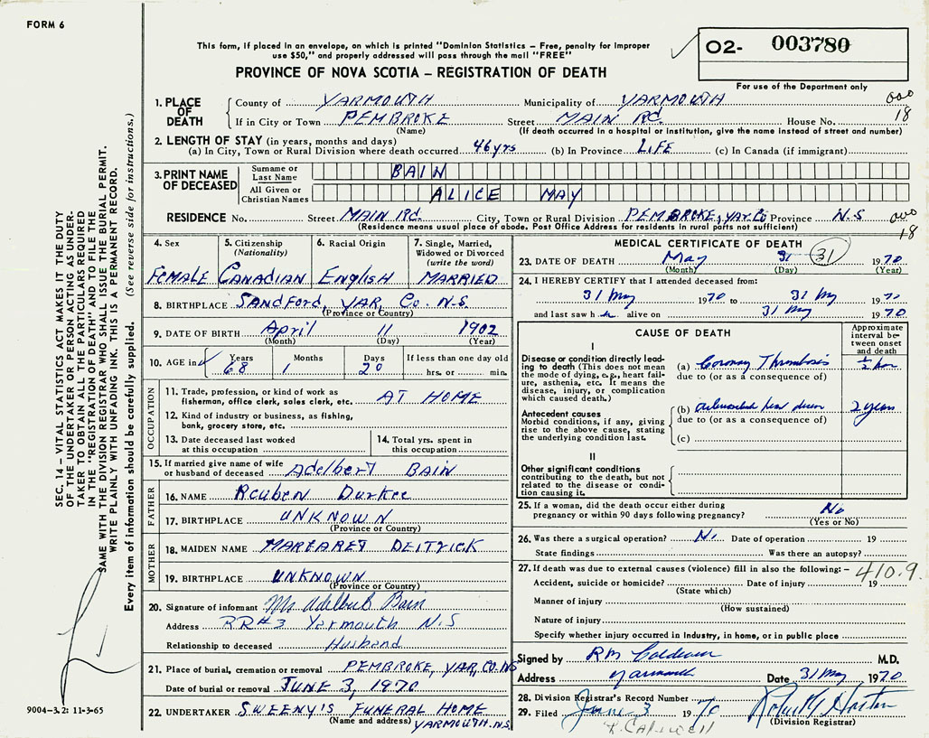 PROVINCE OF NOVA SCOTIA — REGISTRATION OF DEATH