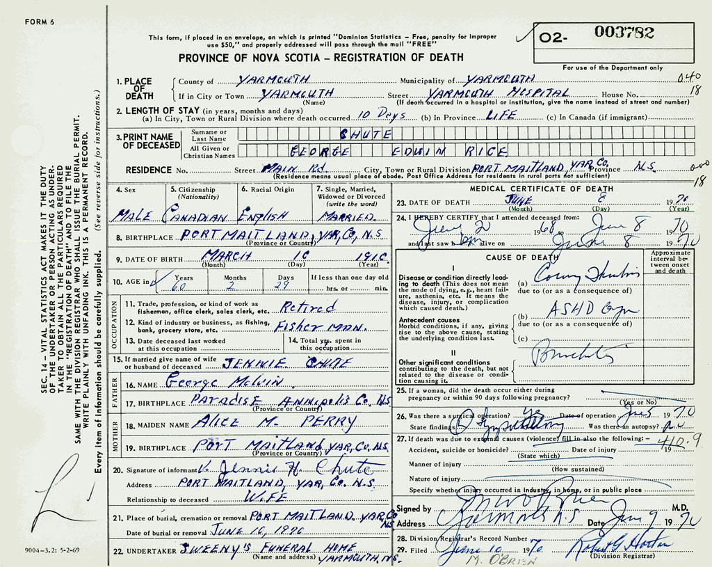PROVINCE OF NOVA SCOTIA — REGISTRATION OF DEATH