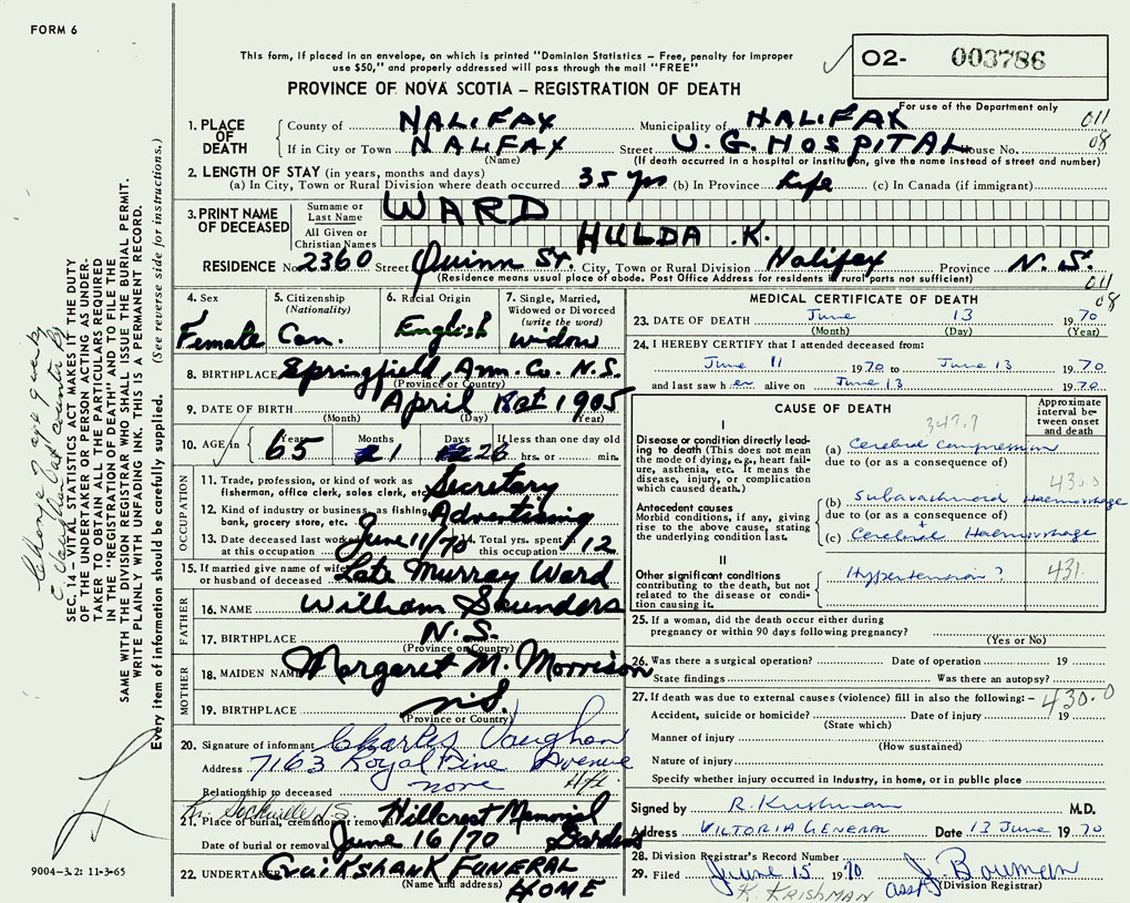 PROVINCE OF NOVA SCOTIA — REGISTRATION OF DEATH