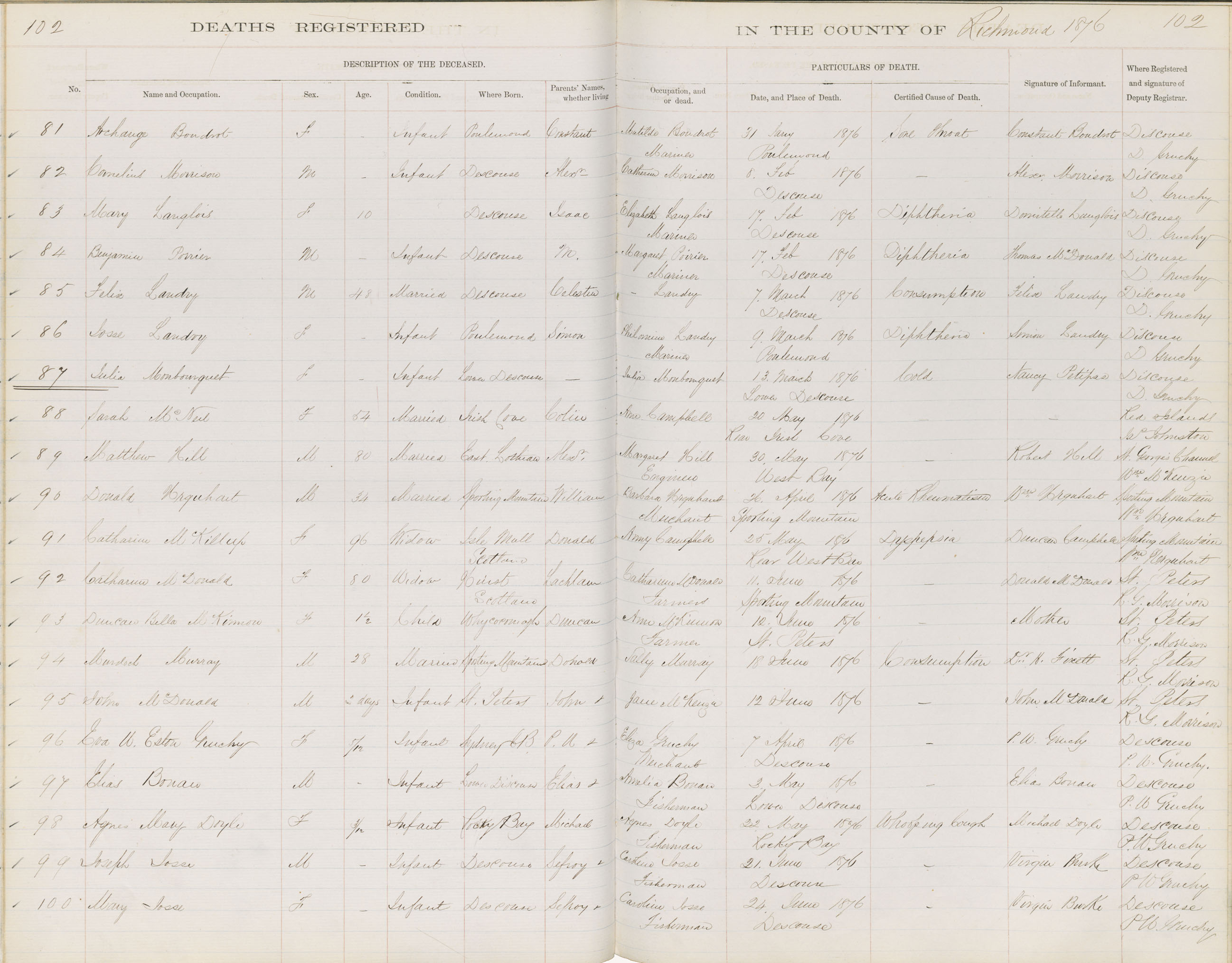 Death Registration: Year: 1876 book: 1815 page: 102 number: 100