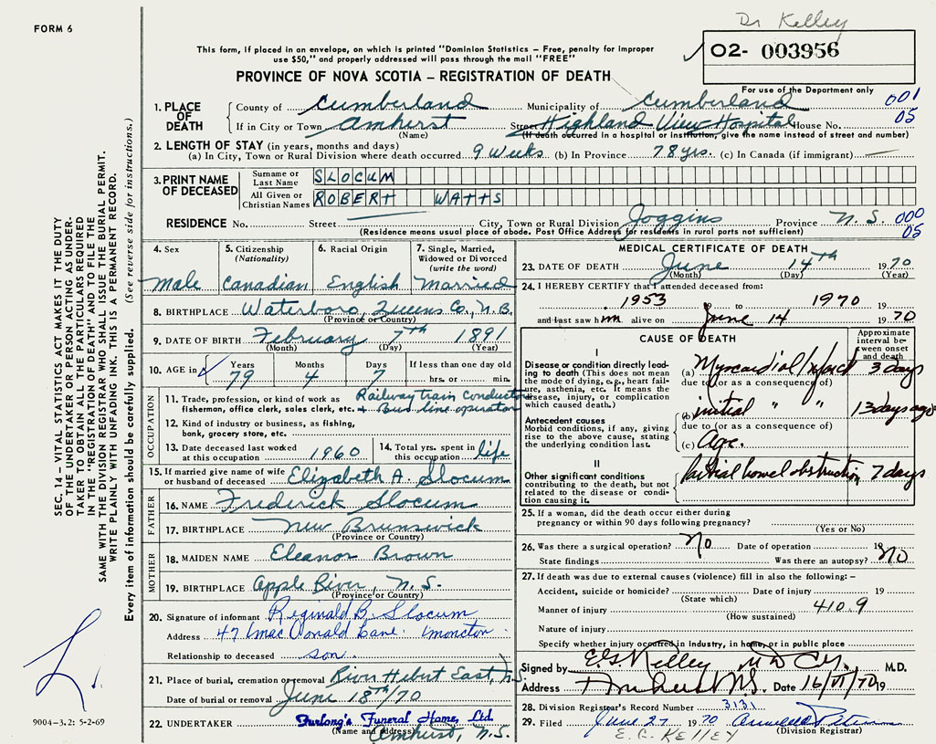 PROVINCE OF NOVA SCOTIA — REGISTRATION OF DEATH