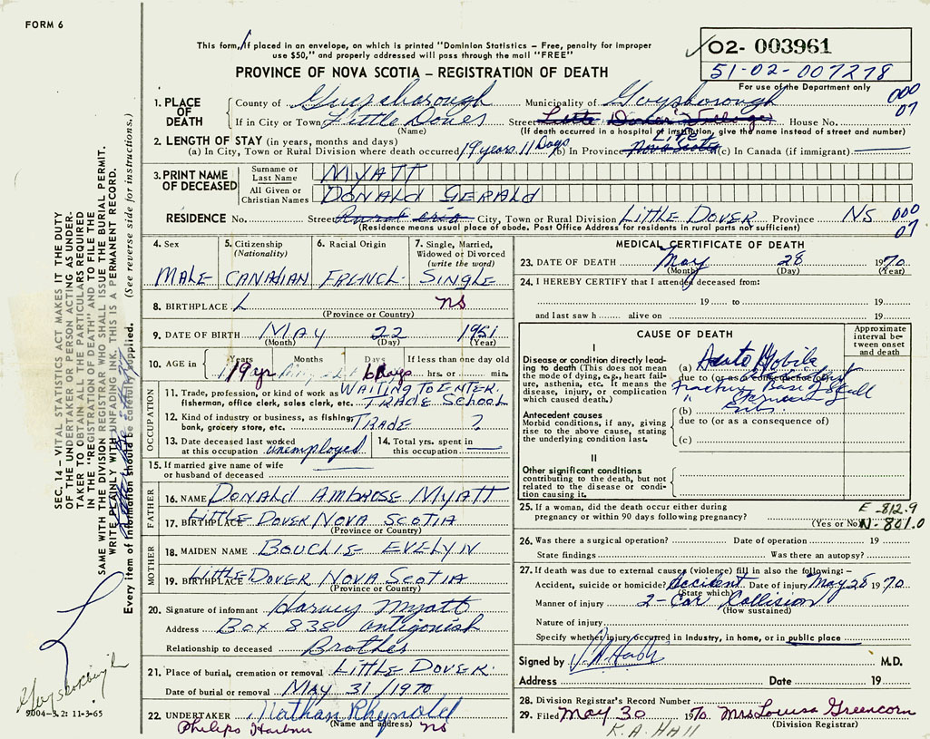 PROVINCE OF NOVA SCOTIA — REGISTRATION OF DEATH