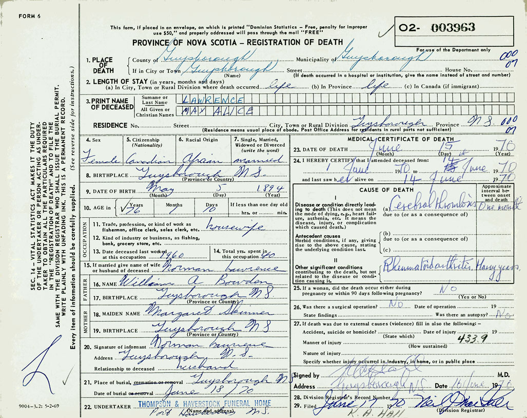 PROVINCE OF NOVA SCOTIA — REGISTRATION OF DEATH