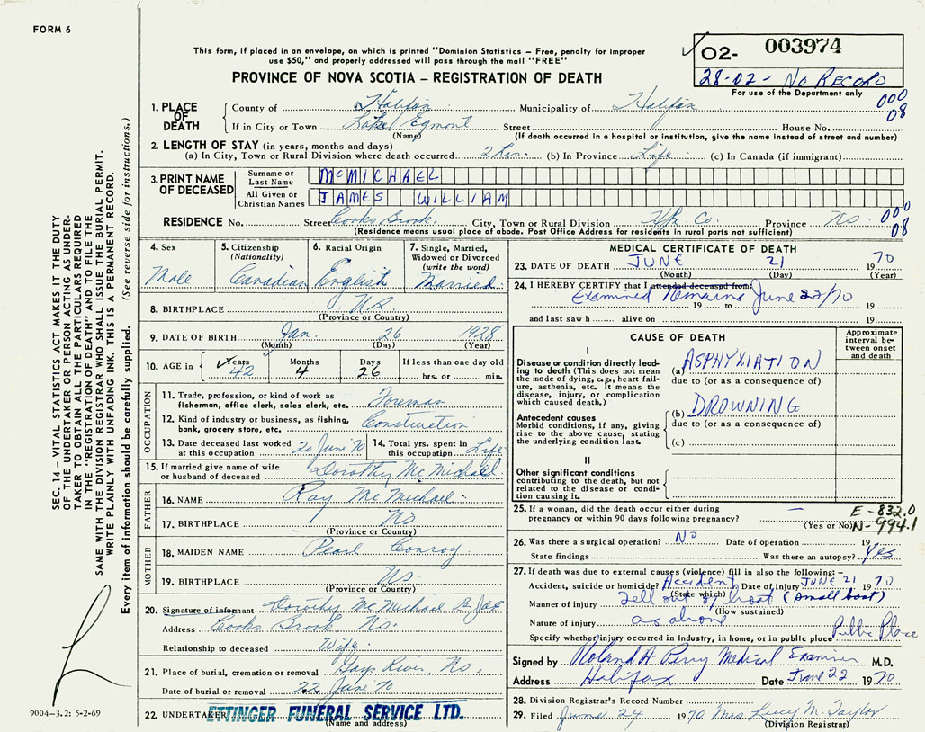 PROVINCE OF NOVA SCOTIA — REGISTRATION OF DEATH