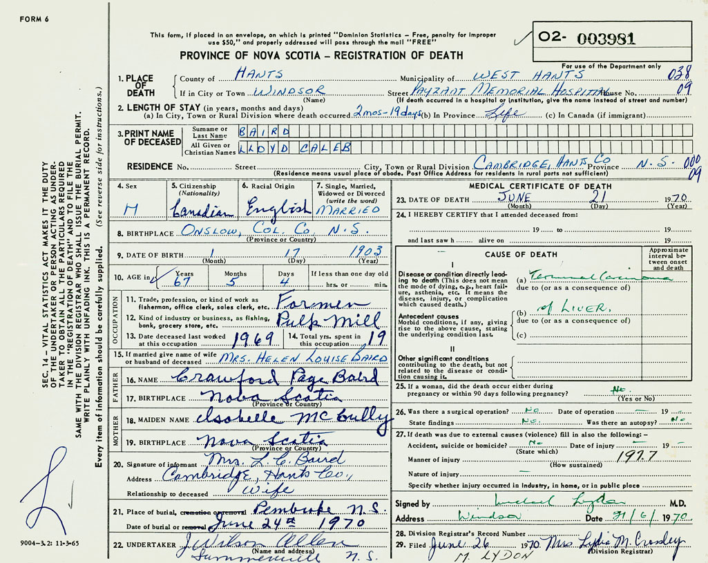 PROVINCE OF NOVA SCOTIA — REGISTRATION OF DEATH