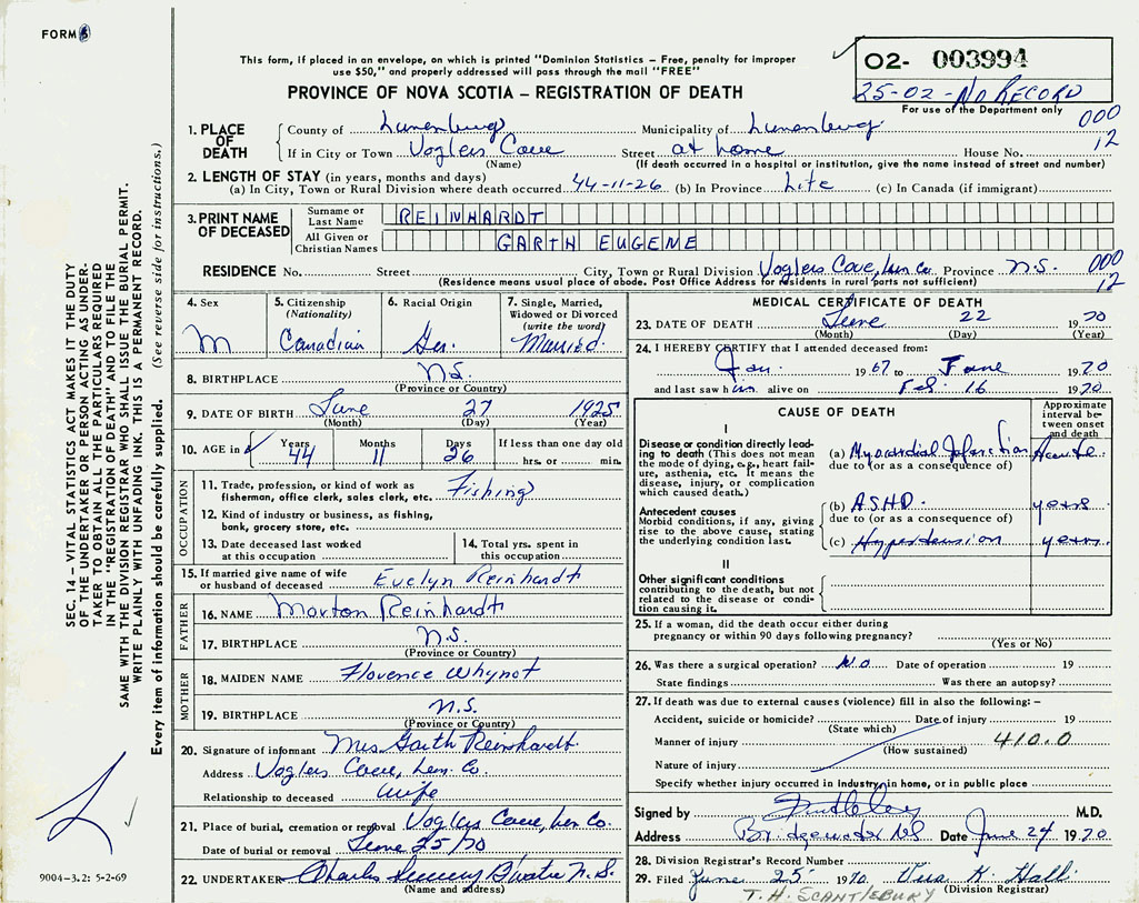 1. PLACE OF DEATH County of Lunenburg If in City or Town Voglers Cove