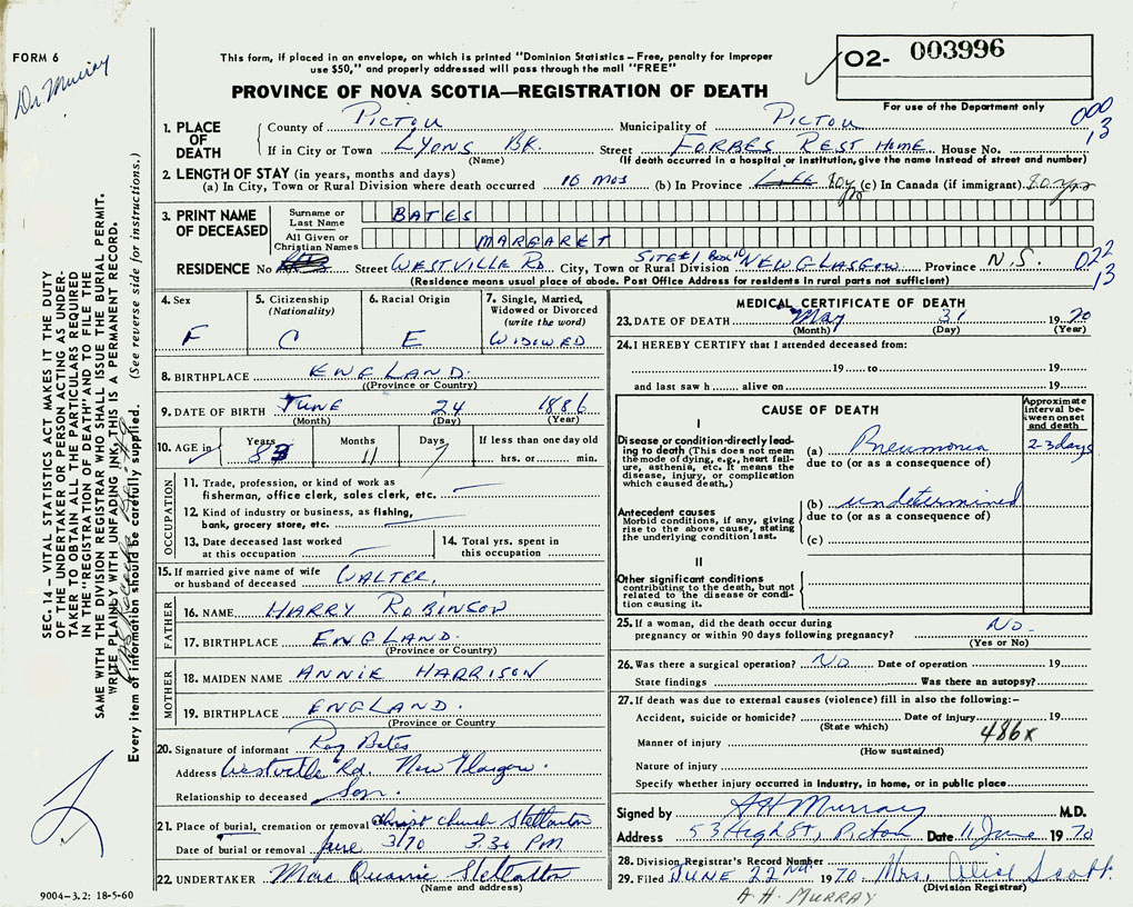 PROVINCE OF NOVA SCOTIA — REGISTRATION OF DEATH