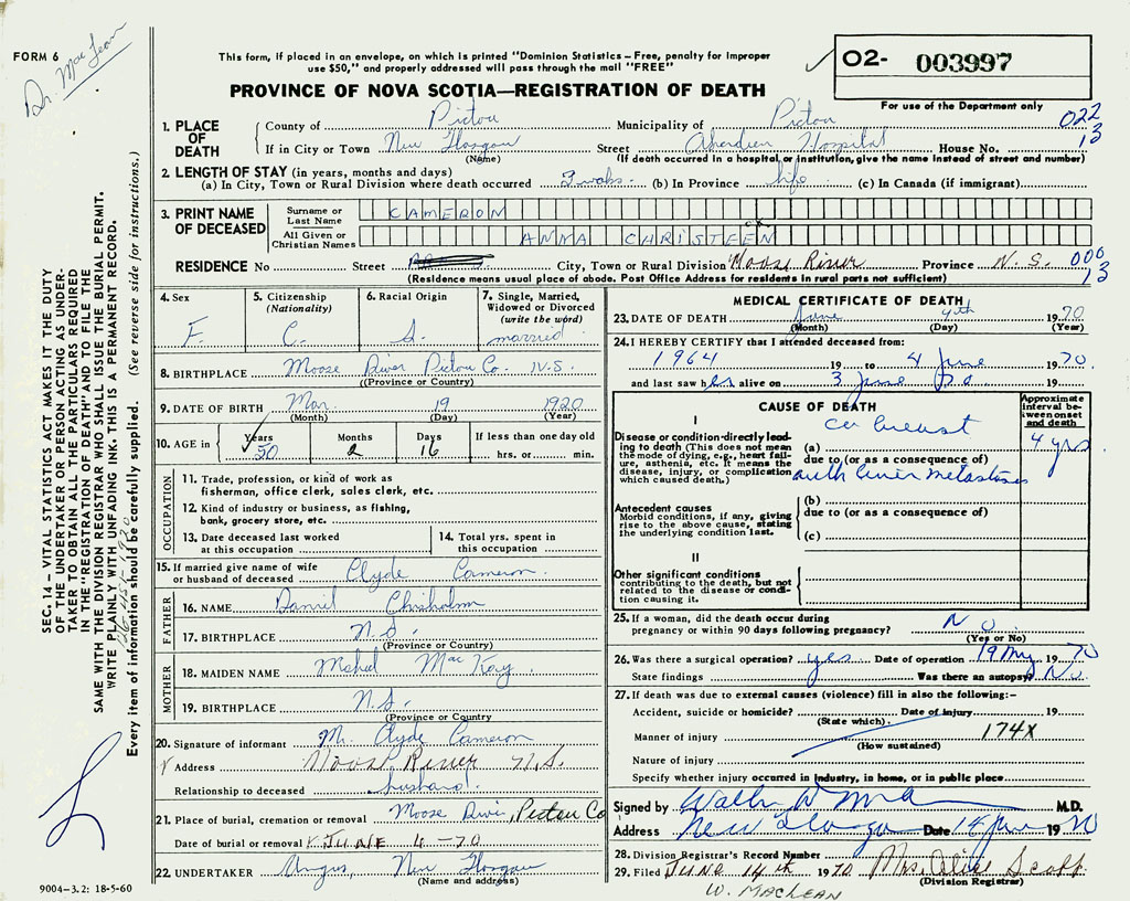 1. PLACE OF DEATH County of Pictou If in City or Town New Glasgow