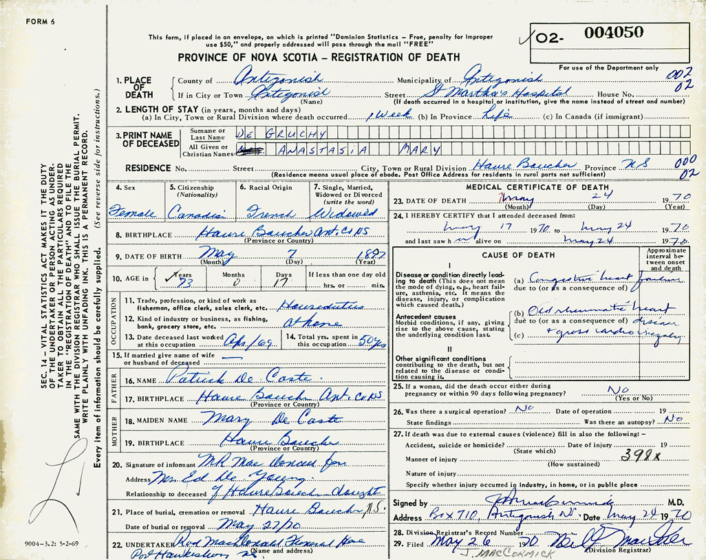 1. PLACE OF DEATH County of Antigonish If in City or Town Antigonish