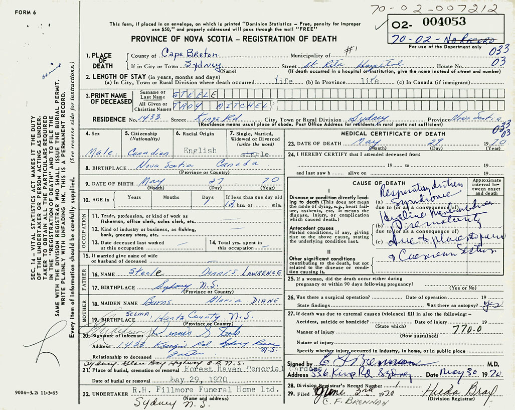 1. PLACE OF DEATH County of Cape Breton If in City or Town Sydney