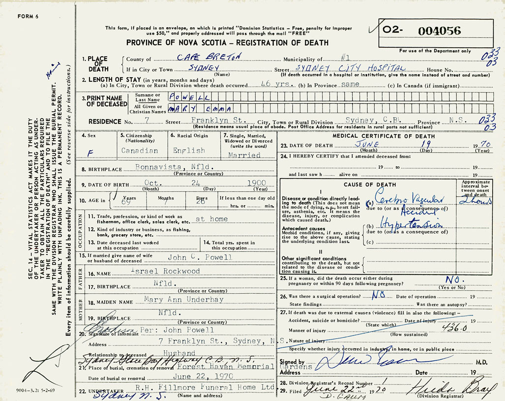 1. PLACE OF DEATH County of Cape Breton If in City or Town Sydney