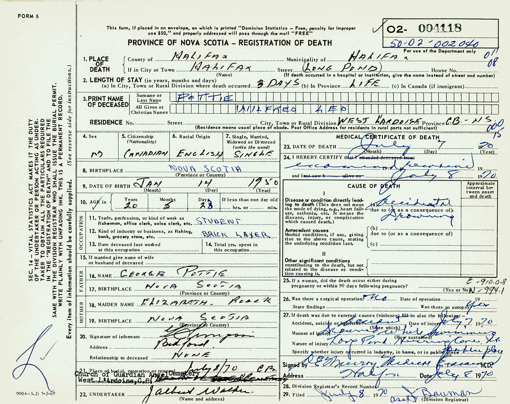 PROVINCE OF NOVA SCOTIA — REGISTRATION OF DEATH