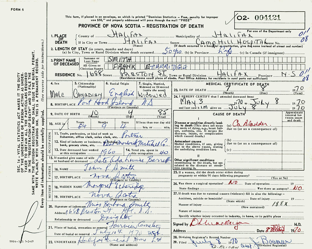 PROVINCE OF NOVA SCOTIA — REGISTRATION OF DEATH
