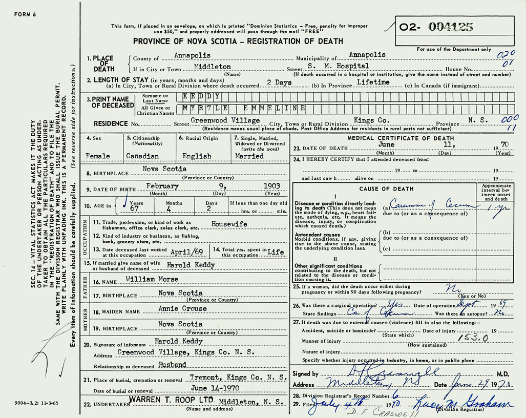 PROVINCE OF NOVA SCOTIA — REGISTRATION OF DEATH