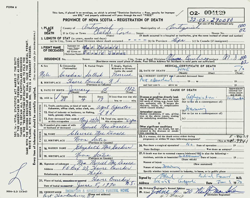 PROVINCE OF NOVA SCOTIA — REGISTRATION OF DEATH