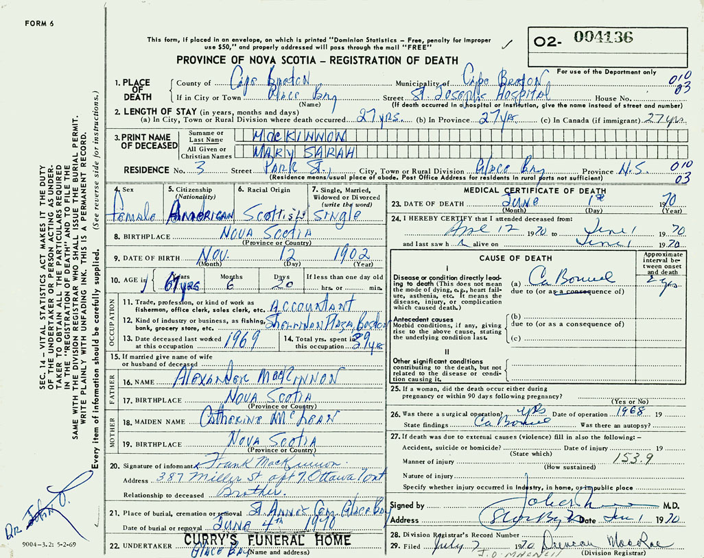 1. PLACE OF DEATH County of Cape Breton If in City or Town Glace Bay