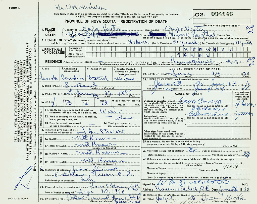 1. PLACE OF DEATH County of Cape Breton If in City or Town Glace Bay