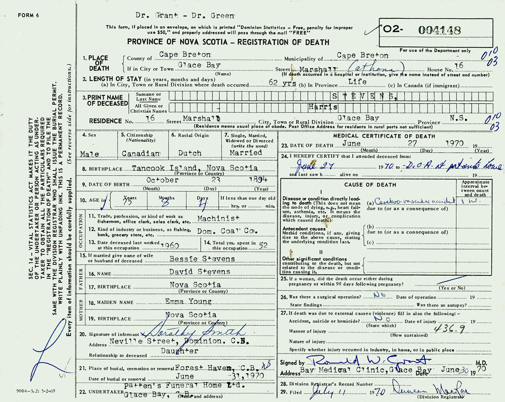 1. PLACE OF DEATH County of Cape Breton If in City or Town Glace Bay