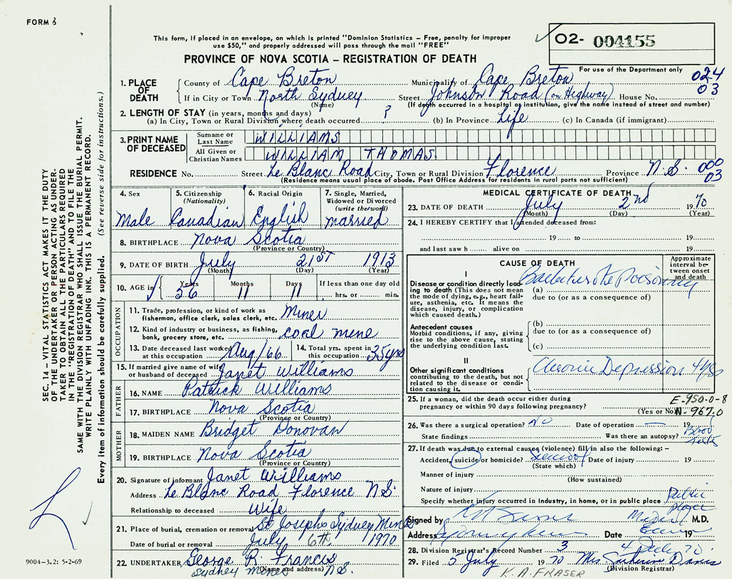 PROVINCE OF NOVA SCOTIA — REGISTRATION OF DEATH