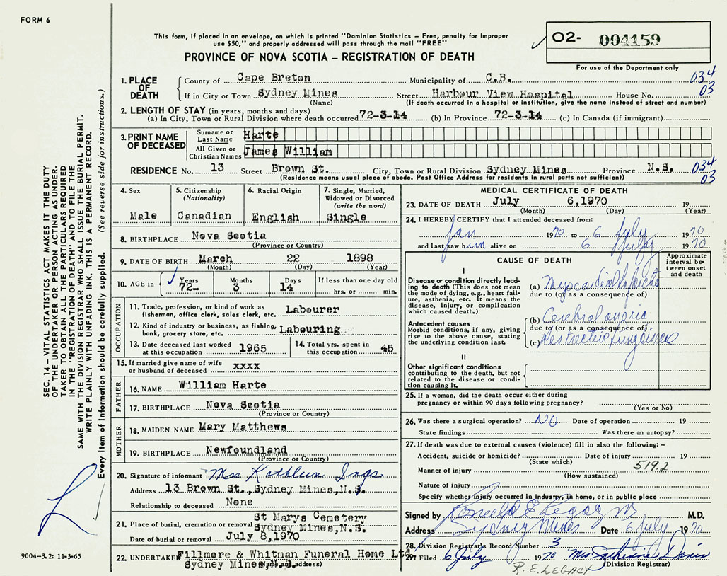 1. PLACE OF DEATH County of Cape Breton If in City or Town Sydney Mines