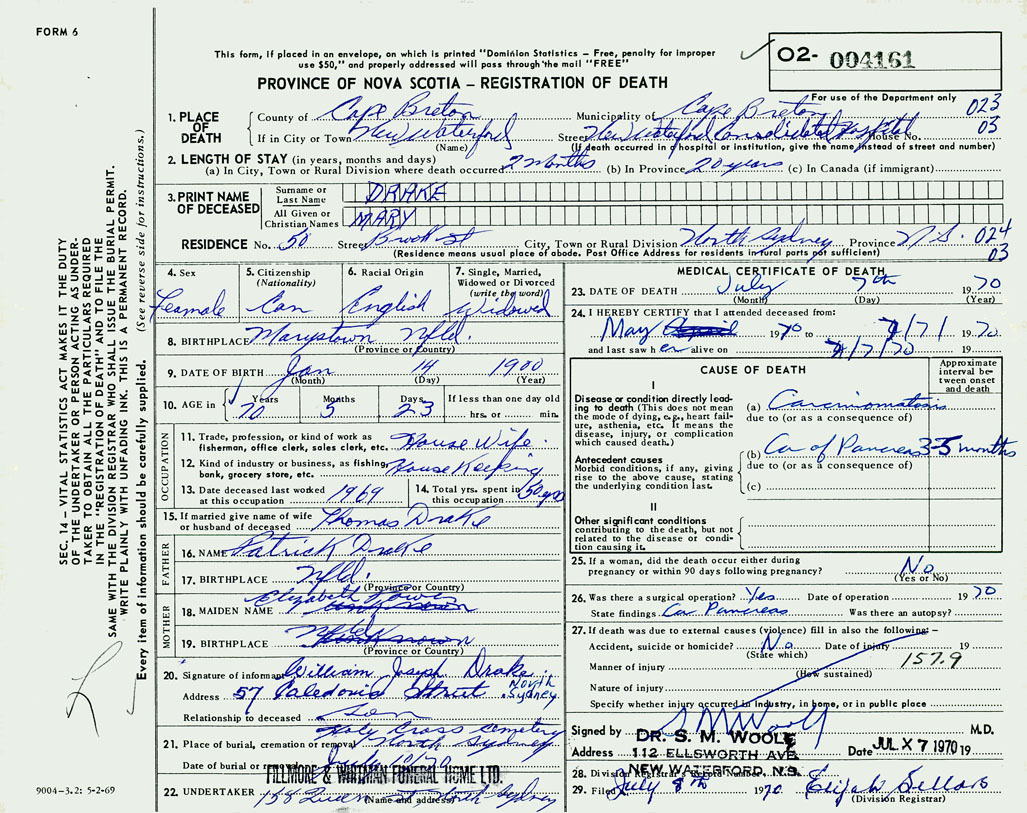 1. PLACE OF DEATH County of Cape Breton If in City or Town New Waterford