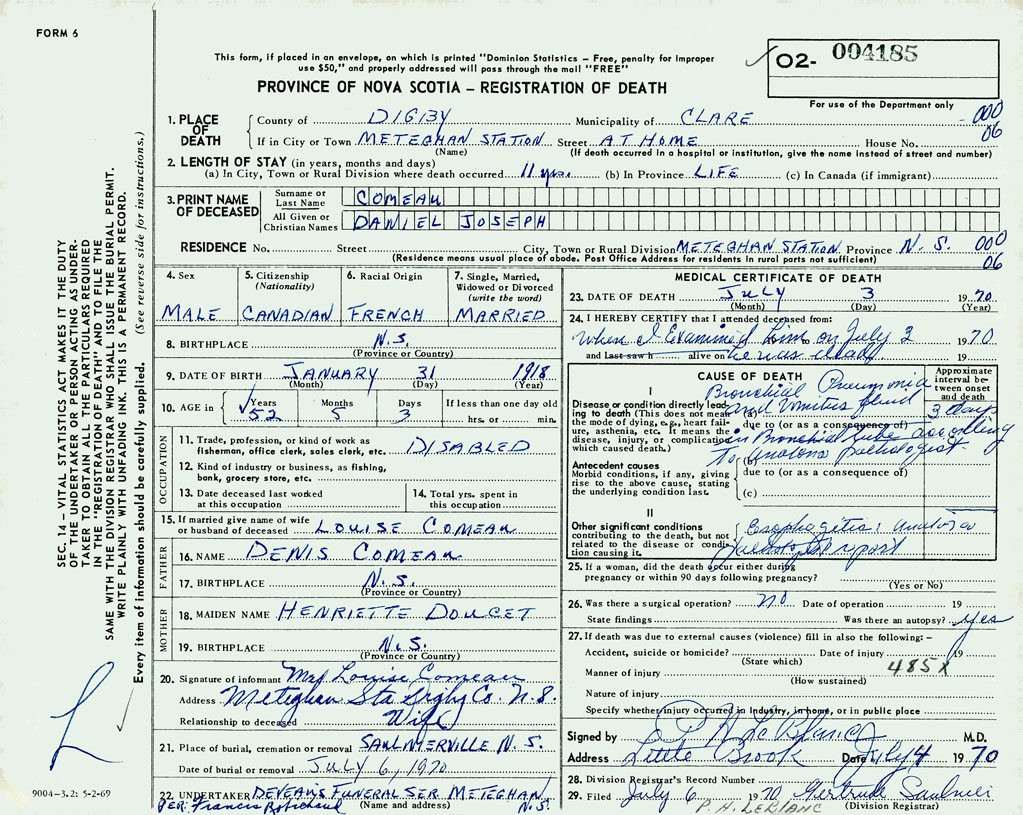 1. PLACE OF DEATH County of Digby If in City or Town Meteghan Station