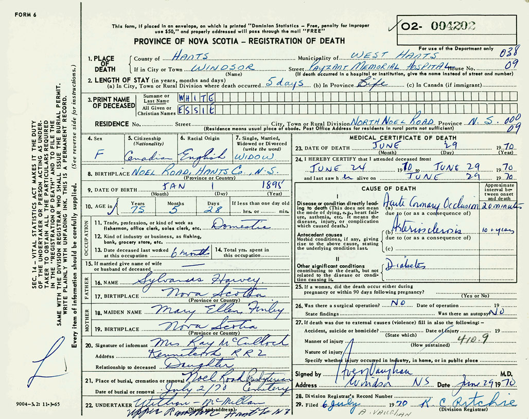 1. PLACE OF DEATH County of Hants If in City or Town Windsor