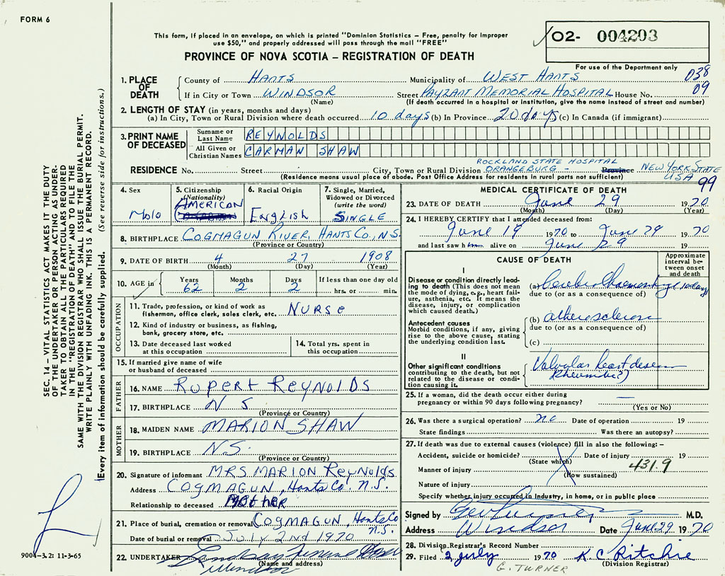 PROVINCE OF NOVA SCOTIA — REGISTRATION OF DEATH