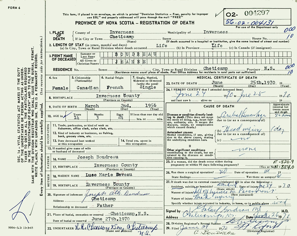 1. PLACE OF DEATH County of Inverness If in City or Town Cheticamp