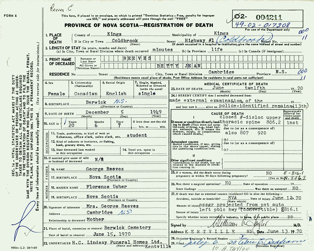 PROVINCE OF NOVA SCOTIA — REGISTRATION OF DEATH