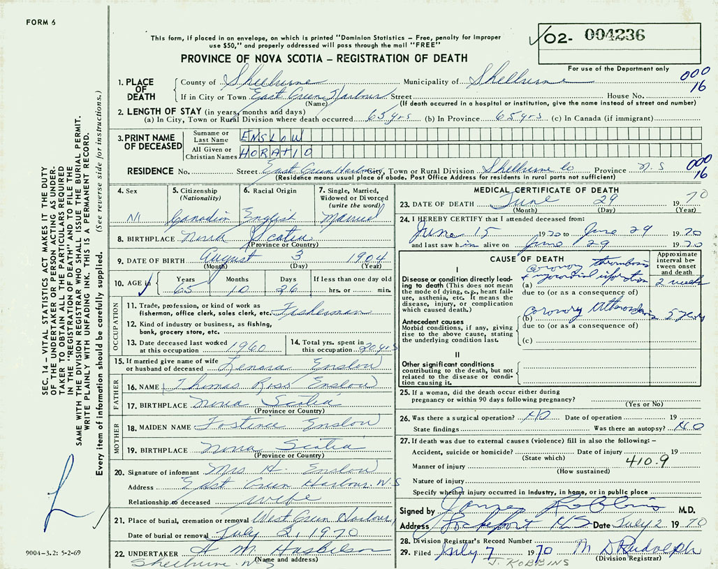 1. PLACE OF DEATH County of Shelburne If in City or Town East Green Harbour