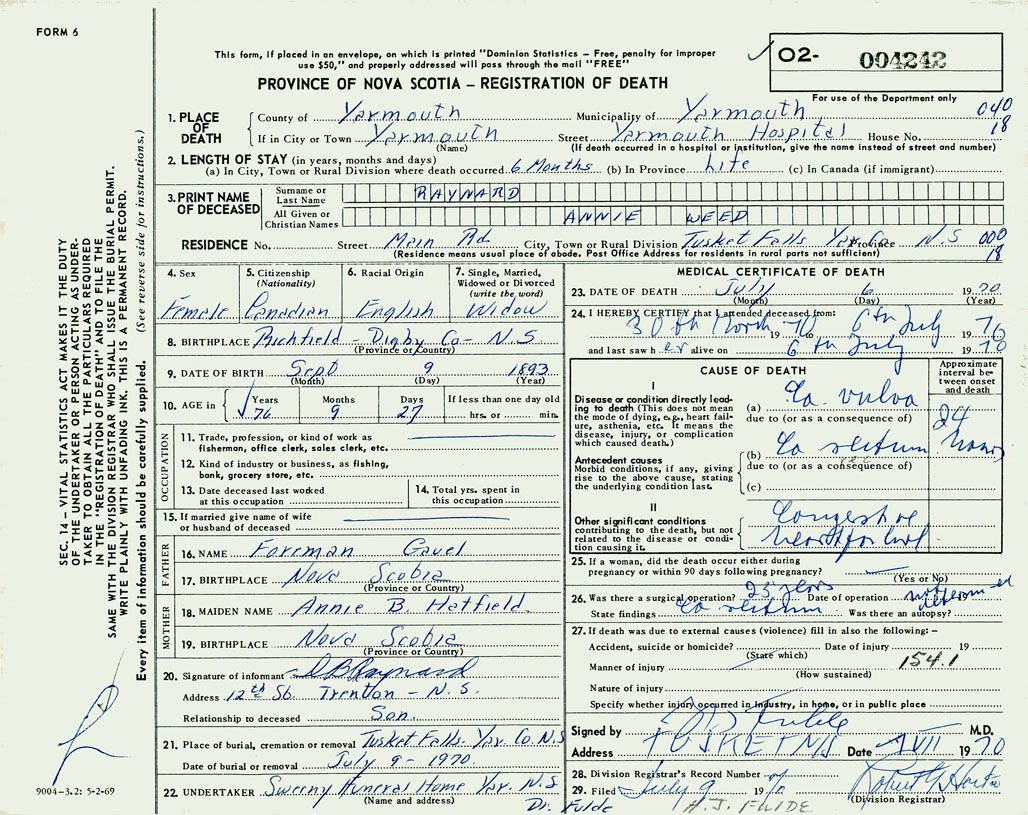 PROVINCE OF NOVA SCOTIA — REGISTRATION OF DEATH