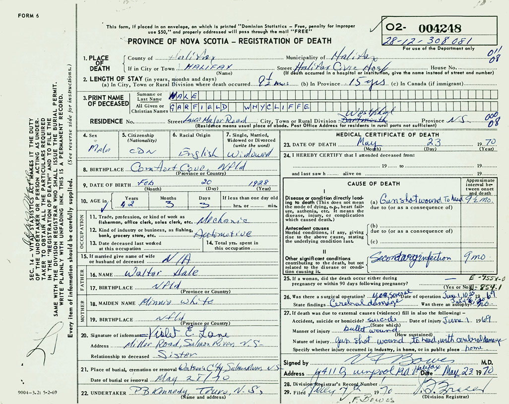 PROVINCE OF NOVA SCOTIA — REGISTRATION OF DEATH
