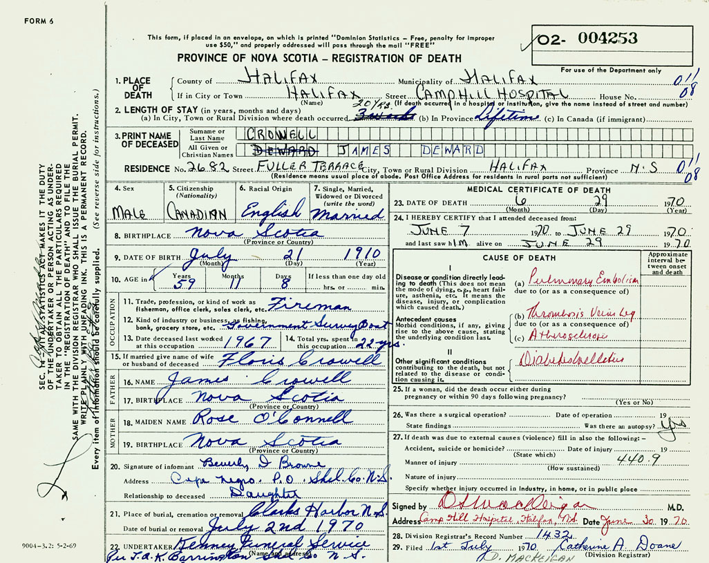 PROVINCE OF NOVA SCOTIA — REGISTRATION OF DEATH