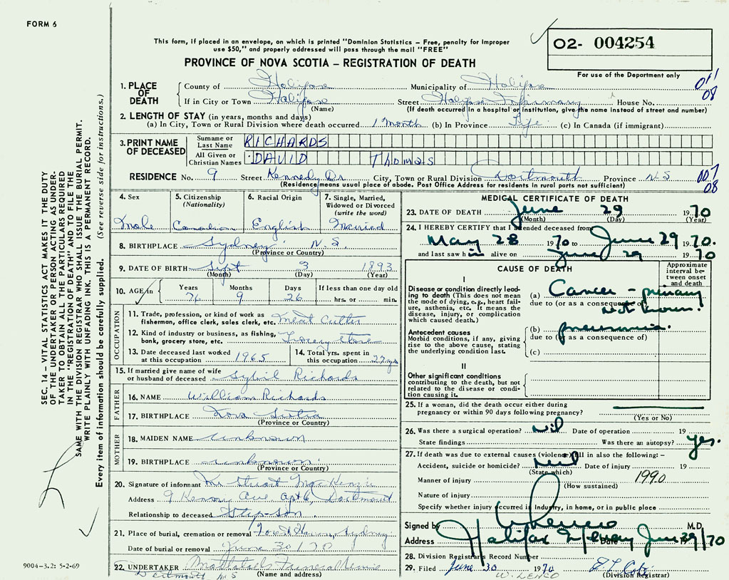 PROVINCE OF NOVA SCOTIA — REGISTRATION OF DEATH