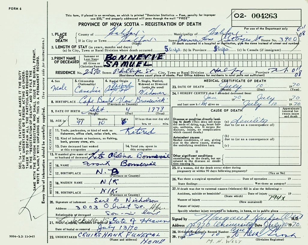 PROVINCE OF NOVA SCOTIA — REGISTRATION OF DEATH